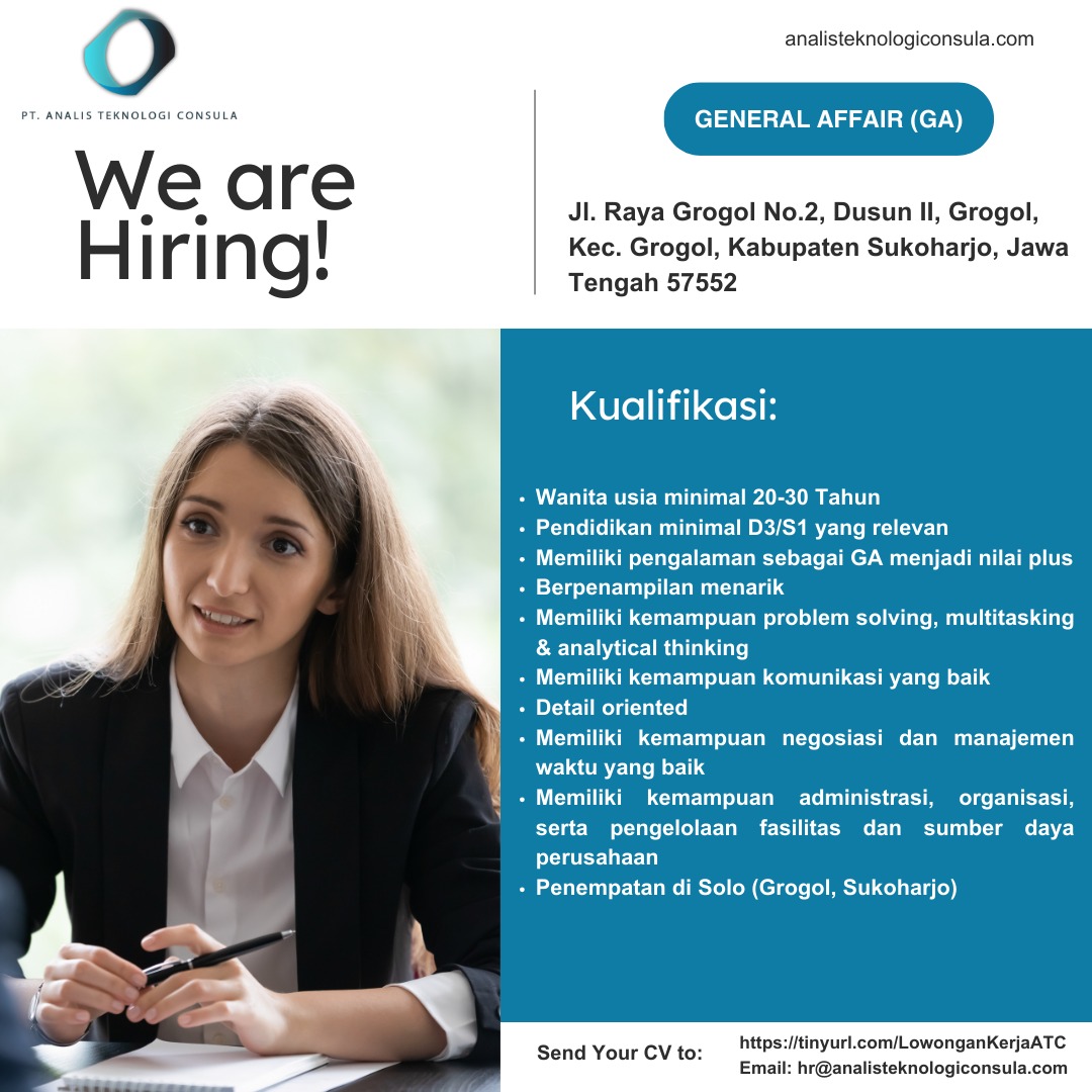 Loker PT Analis Teknologi Consula Penempatan Sukoharjo Maret 2025 - PT Analis Teknologi Consula atau yang lebih dikenal sebagai ATC berdiri pada tanggal 29 September 2021, yang pada awalnya adalah sebuah perusahaan yang bergerak pada bidang Teknologi Informasi. Masih terkorelasi dengan bidang awal pendirian, seiring berjalannya waktu dan juga permintaan pasar, maka ATC mulai mengembangkan unit usaha Business Process Outsourcing - Contact Center Solution untuk memenuhi kebutuhan pelanggan.